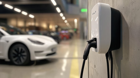 An electric vehicle charger is mounted on the wall in a contemporary garage while a parked electric car is visible nearby.