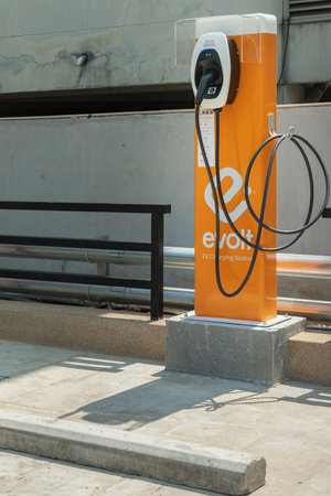 Bangkok, Thailand - Feb 18, 2023 : Vertical shot of The Evolt electric car charging point at a car park. Electric Vehicle Charging Station in a commercial parking lot, Space for text, Selective focus.