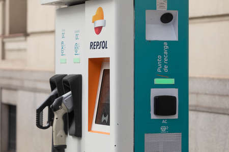 Madrid, Spain - February 07, 2021: Charging point for electric and hybrid cars in the center of the city of Madrid. Charging station in public roads for electric and sustainable mobility.