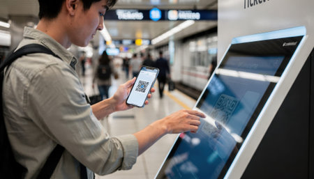Medium shot of a person scanning a mobile QR code at a sleek digital ticket kiosk in a bustling transit station with blurred background commuters.