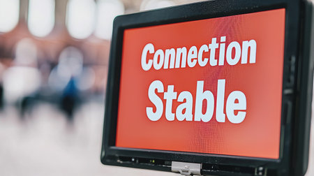 A vibrant red sign indicating Connection Stable serves to inform commuters in a busy public space. The digital display enhances communication and reassurance.