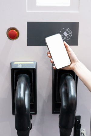 Close-up hand of businessman who using smart card touch on monitor sensor for rechargeable battery to Electricity Vehicles or EV car