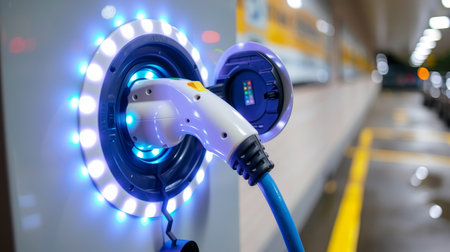 EV charging port with glowing lights. Clean energy and sustainable urban transportation