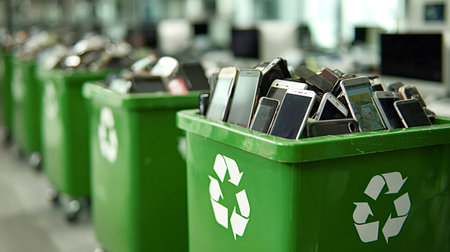 Green recycling bins overflowing with obsolete smartphones and mobile devices, highlighting e waste accumulation and the need for responsible disposal, recycling, and environmental protection
