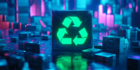 A conceptual background with a large, neon green recycling icon surrounded by abstract, geometric shapes in contrasting colors on a dark, glossy surface.