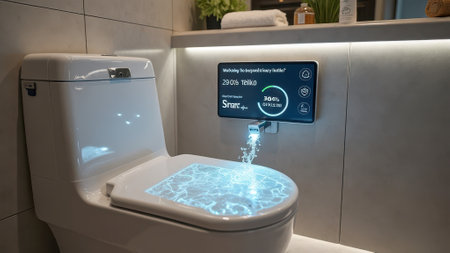 Smart toilet with interactive display and water projection in modern bathroom setting. That the image is generated using AI.