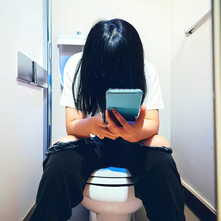 A person sitting on a toilet, browsing on their phone with AI.