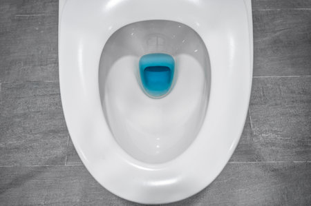 Cleaning and disinfection concept. White toilet bowl with blue detergent after flush.