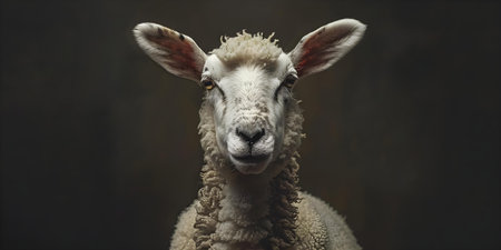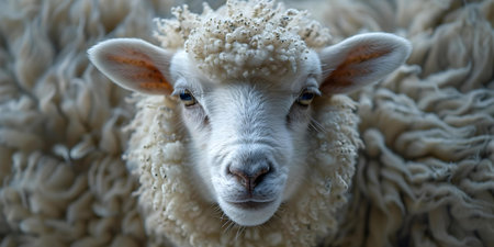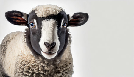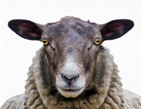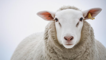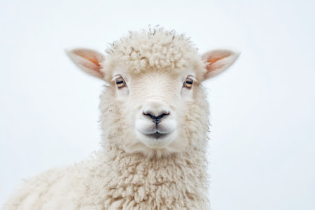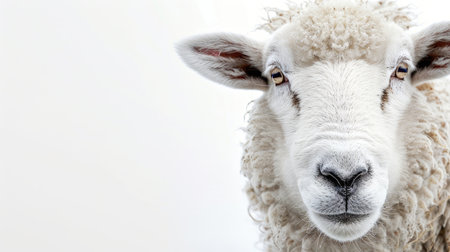 Close-up of a sheep's face with a soft, innocent gaze, against a high-key white background