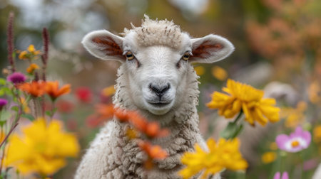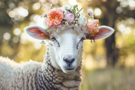 Beautiful cute sheep with flowers wreath on its head
