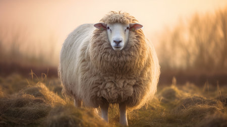 A calm sheep with a unique face marking is captured up-close in a golden-lit farm pasture, evoking a rural ambiance and serene atmosphere.