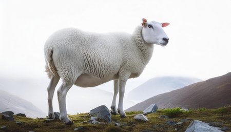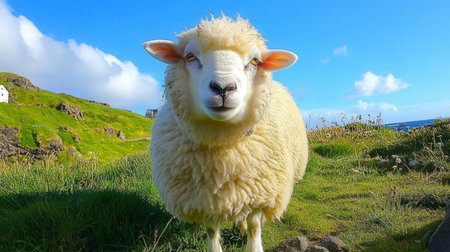 a sheep stands against a minimalist blue background, showcasing the style of a texture-based graphic designer. the image captures the symmetrical asymmetry with a touch of kodak vision3 200t film aesthetic. shot in stunning 8k resolution, the sheep's presence is enhanced by the contrasting dark teal and light beige tones, creating a visually captivating composition. ai generated