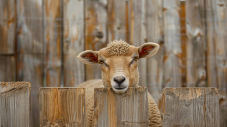 A curious white sheep is peeking over a sturdy wooden fence, its ears perked and eyes alert. The sheeps fluffy coat contrasts with the rough texture of the fence, creating a charming rural scene.