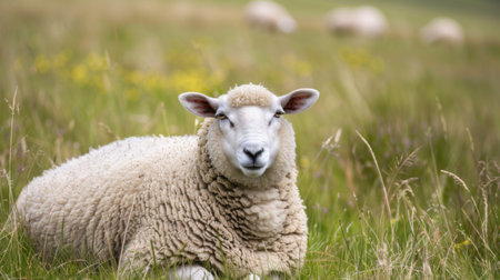 Cute sheep grazing in a flower meadow
