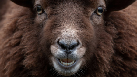 Cute closeup of smiling, amusing sheep with teeth witty sheep Sheep with teeth smiling in a portrait. Generative AI