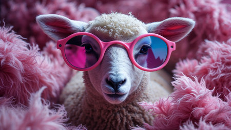 Close up of a lamb wearing pink sunglasses while lying on a pink fluffy blanket, creating a vibrant and playful scene. Ai generated image