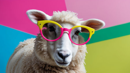 A sheep with fluffy wool and stylish pink sunglasses looks confidently at the camera, surrounded by a bright and colorful backdrop. The unique style adds charm to the lively scene.