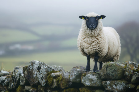 Sheep with black head and legs standing on a stone wall in a misty rural landscape