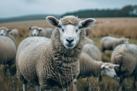 A lone sheep stands apart from the herd, gazing up with a sense of individuality and distinctiveness, evoking the notion of uniqueness and standing out