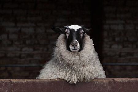 Curious sheep with black and white colored head and lavish wool looking out from the barn