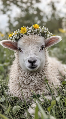 small lamb with fluffy wool, wearing a small flower crown, lying in a meadow, peaceful and pure, --chaos 10 --ar 9:16 --style raw --v 6.1 Job ID: bbc238bb-0651-440b-a720-351cb5616cb2