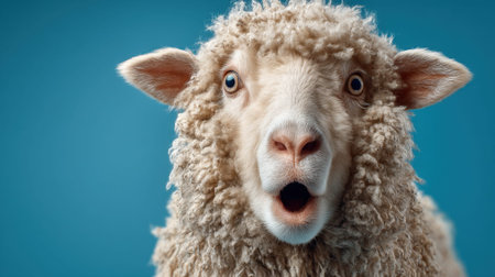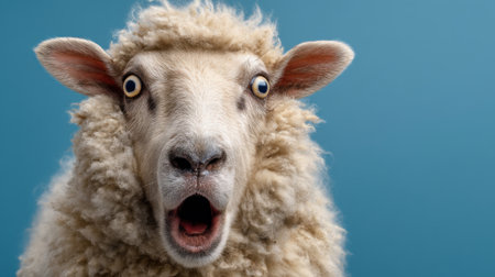 Surprised sheep with fluffy wool against blue background.