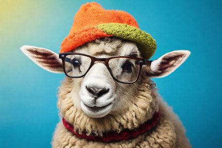 Portrait of a funny sheep wearing glasses and a hat. Isolated on blue background.