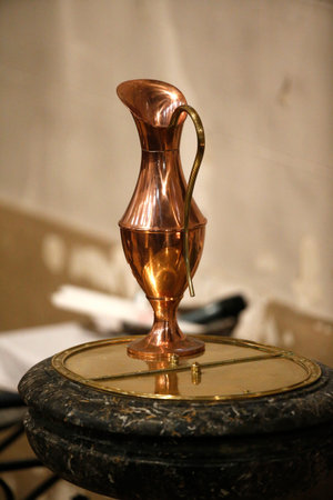 Plasencia, Spain - May 21h, 2022: Liturgical wash basin and pitcher over Saint Nicholas Church altar, Plasencia, Caceres, Extremadura, Spain