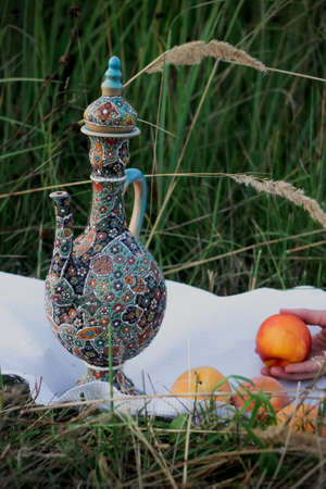Oriental jug and peaches on a field with grass.