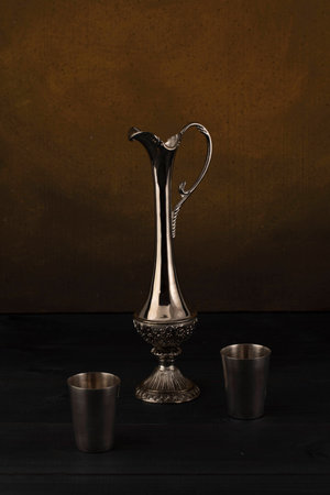 Vintage silver jug with glasses on a dark background and boards