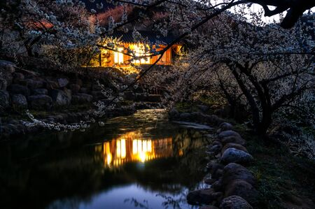 Traditional Korean house among the plum flowers in Plum Flower village reflecting off a little lake.