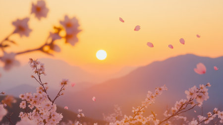 Experience the enchanting beauty of cherry blossoms at sunset, where delicate petals float gracefully in the warm evening breeze against a serene mountain backdrop.