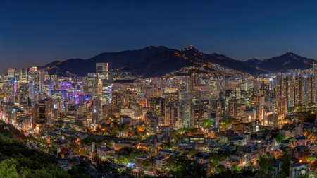 Beautiful vibrant aerial sunset view of Seoul, South Korea skyline, with mountains and sprin scenery beyond the city, seen from observation deck of Namsan Park, Gyeonggi-do province, Republic of Korea