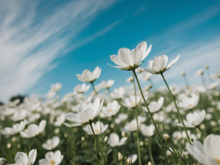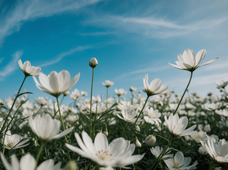 AI Generated. A close up of a field of white flowers with a blue sky in the background