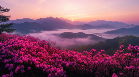 Stunning spring view of Hwangmaesan Mountain covered in pink azaleas at sunrise, with mist rolling over the nearby mountain range near Hapcheon-gun, South Korea.