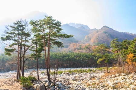 colorful trees and overlap mountain and sunlight at Seoraksan national park in autumn ,South Korea