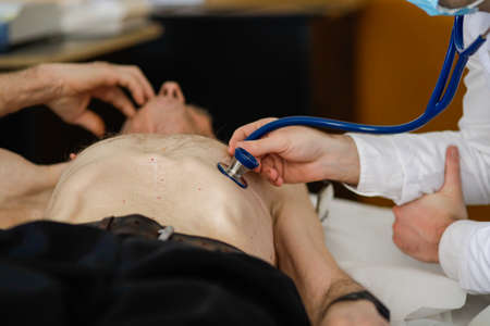 doctor listening to the patient's breathing through the stethoscope, the nurse listens to the heartbeat of the patient, examination of the patient