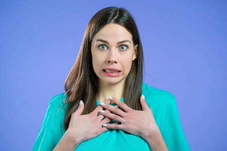 Portrait of unpleasantly surprised and shocked girl on violet studio background. Woman receiving bad news. She expresses sympathy and regret.