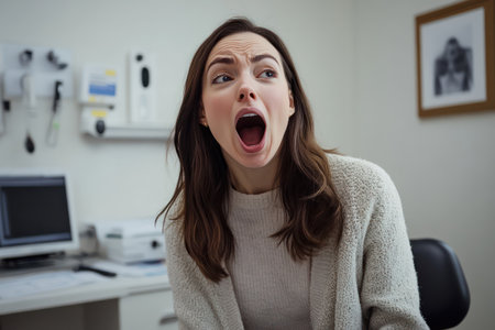 Woman yawns in a white clinical exam room, tired from long waiting, showing realistic emotion in a modern medical setting.