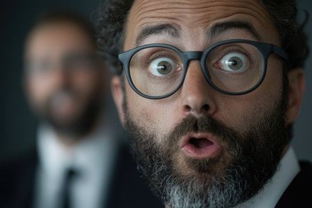 Man in suit expressing surprise with dramatic gesture in bright room.