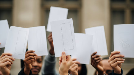 A group of individuals standing in a straight line, each holding papers in their hands, People in a long queue holding tax documents during tax season, AI Generated