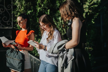 Three businesswomen in an outdoor meeting, discussing notes and documents on a sunny day
