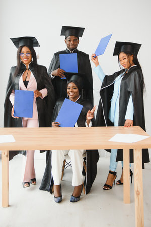 Scrolls of diplomas in the hands of a group of graduates. Graduation.University gesture and people concept.