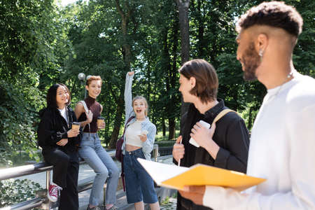Excited multiethnic students holding coffee to go near blurred friends in park
