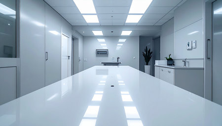 In a pristine, high-tech facility, a long, reflective table awaits the next breakthrough. The sterile, minimalist environment suggests precision, advanced research, and the cutting edge of science and medicine.