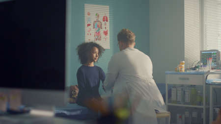 Mother watching daughter medical examination in pediatrician office. African american family visit doctor to make tests in pandemic period. Back view physician measuring pressure to preteen girl.