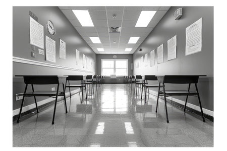 A silent, efficient hall in a state institution. Empty desks and chairs anticipate activity, creating a sterile void filled with hopeful anticipation. AI Generative AI