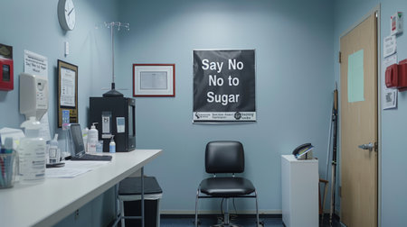 Clinical office with 'Say No to Sugar' campaign poster. Emphasizes the health risks of sugar consumption. Suitable for health awareness campaigns.
