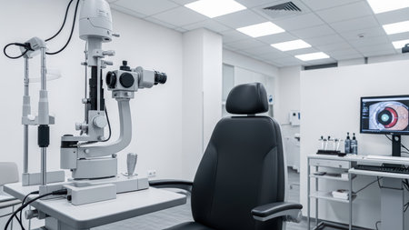 Modern eye exam room with advanced ophthalmology equipment in clinical setting