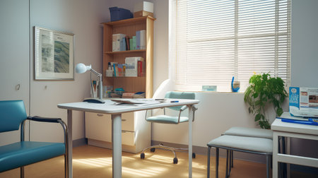Empty doctor office featuring modern medical equipment and drugs, ready for the next patient consultation. Highlighting advanced diagnostics, healthcare services and patient care management.